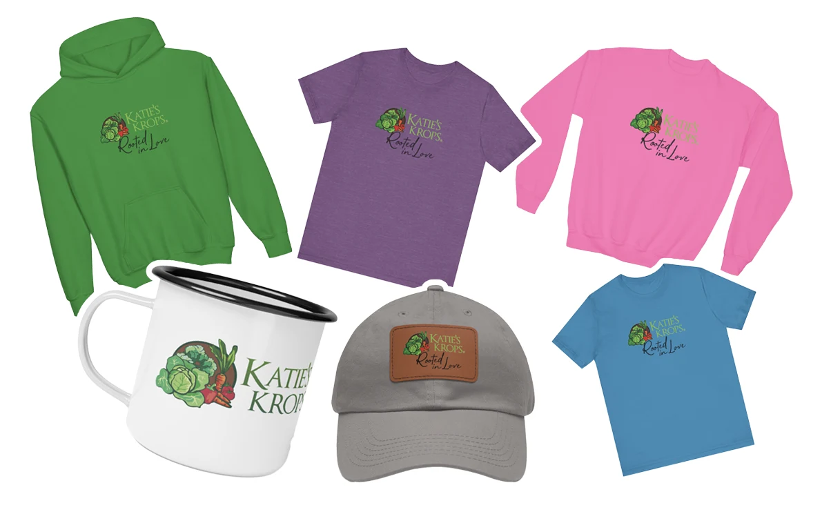 Our new Katie’s Krops merch is here — shirts, hats, and mugs that give back. Every item helps us plant more gardens and feed more families.